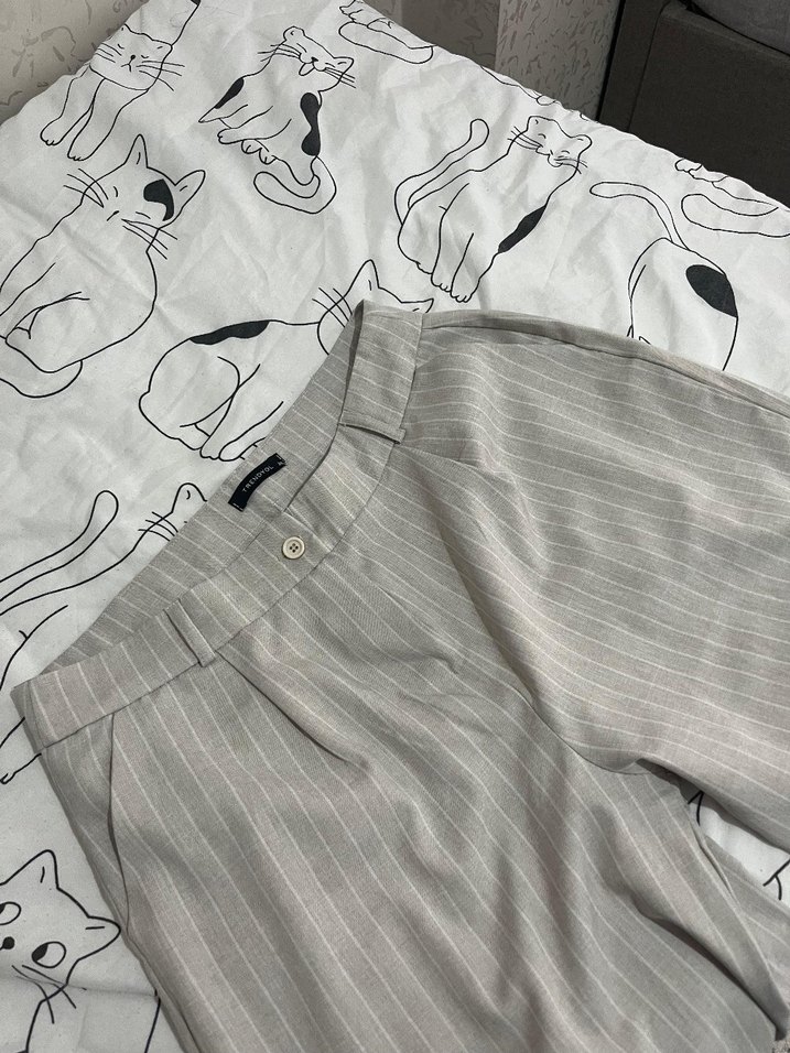 Bej renkli, düğmeli ve ince çizgili keten kumaştan yapılmış, normal boy ve rahat kesim kadın pantolon. Ofis ve günlük kullanıma uygun.