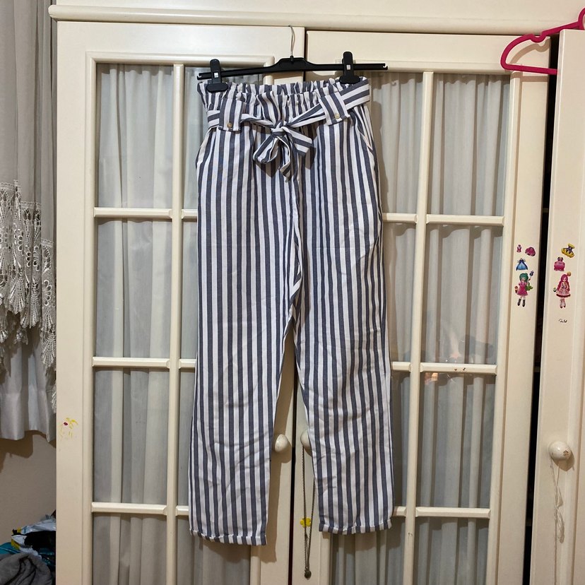 Gri ve beyaz çizgili, kuşaklı midi boy kadın pantolon. Denim kumaştan, rahat kesimli ve günlük kullanıma uygun, Paris sokak stilini yansıtan bir model. Olculerini ekledim. M beden. Kumas pantolon degil, en yakini o diye onu sectim. KTN yaziyor, koton diye dusunuyorum.