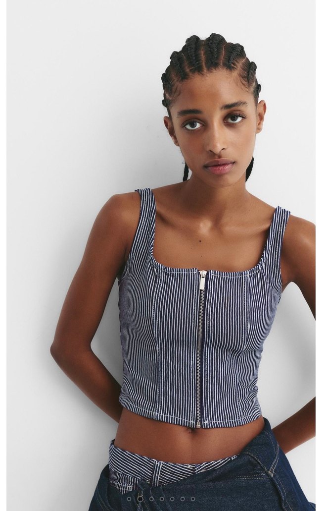 Çizgili lacivert denimden yapılmış, düz yakalı ve askılı, kısa mini boy, fitted kesim bustiyer. Ön fermuarlı, günlük rahat sokak tarzı için uygun.