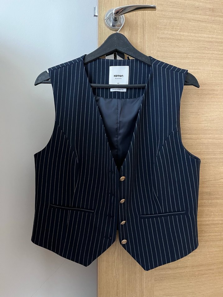 Lacivert çizgili denim kumaştan yapılmış, düğmeli, kolsuz, normal boy kadın yelek. Ofis ve sokak stiline uyumlu, regular fit kesimle tasarlanmıştır. ✨