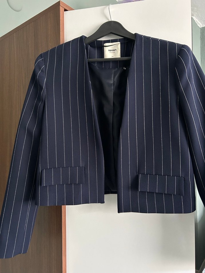 Çizgili, lacivert kadın blazer ceket, kesik yaka ve uzun kolludur. Düğmeli, normal uzunlukta midi kesim ve regular fit yapıya sahiptir. Ofis için uygun, normcore tarzdadır.