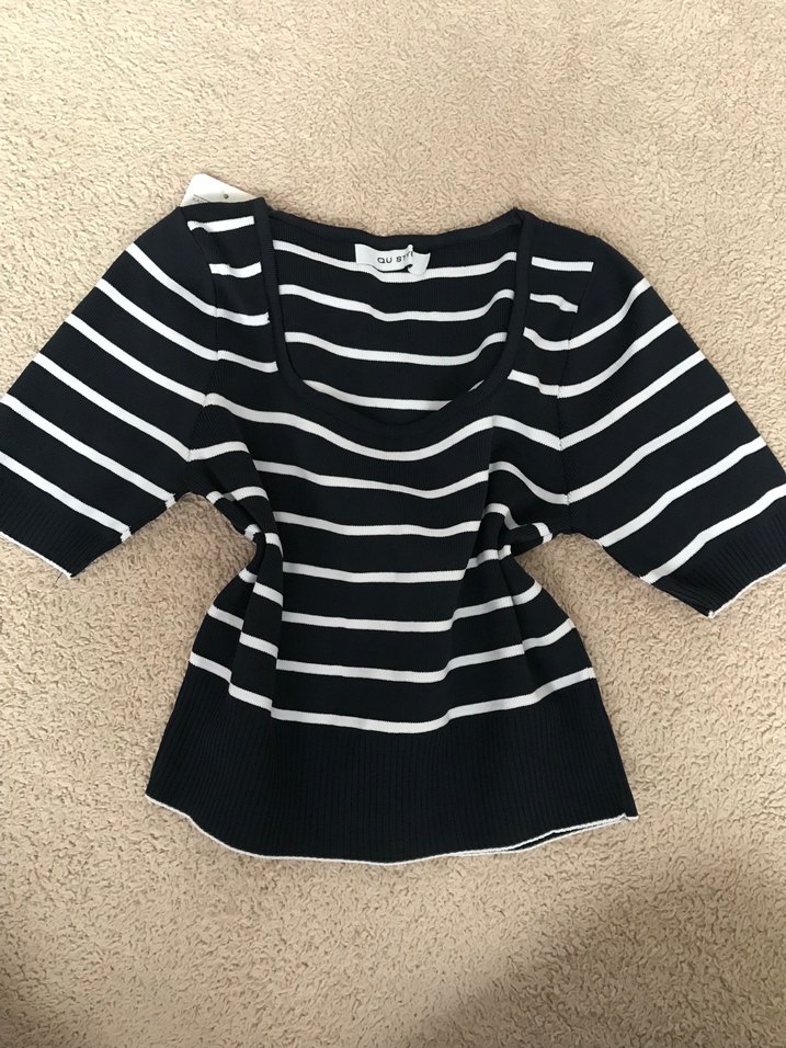 Fitted kesim, kayık yaka ve kısa kollu kadın triko bluz. Yumuşak yün malzemeden, lacivert beyaz çizgili desenli, günlük sokak stiline uygun.