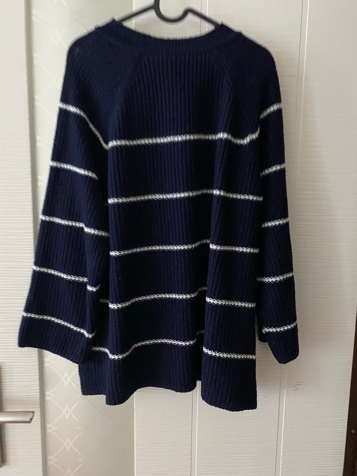 Bu örme lacivert kazak, uzun kollu, yuvarlak yakalı ve bol kesimdir. Gri çizgilerle midi boyda, rahat ve gündelik bir tarz sunar.