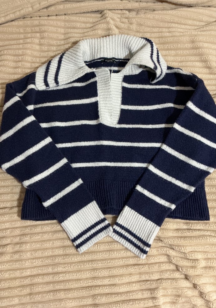 Kazak olduğu için tiftik yaptı başka hiç bir kusuru yoktur. Lacivert ve beyaz çizgili, yakalı ve uzun kollu örme triko kazak, rahat kesimi ve günlük kullanıma uygun sokak stiliyle öne çıkar.