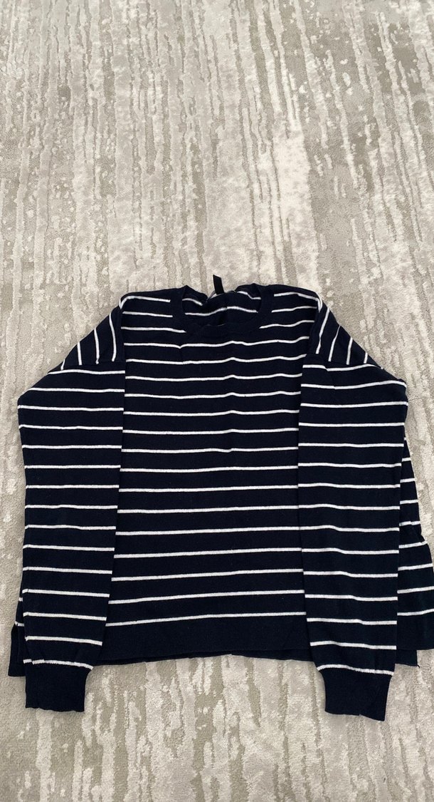 Lacivert renkte, pamuklu örme kumaştan yapılmış, uzun kollu ve kayık yaka çizgili kadın triko sweatshirt. Günlük kullanıma uygun, dar kesim. Tekliflere açığım bir kaç kez giyildi hiçbir kusuru yok