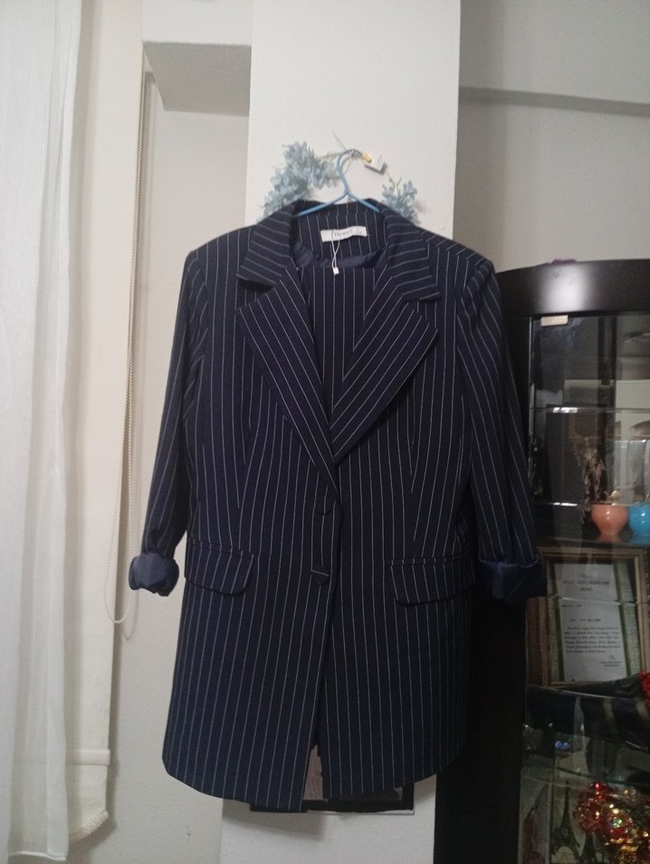 Lacivert çizgili kadın uzun ceket, düğmeli ve uzun kolludur. Regular fit kesimiyle ofis stiline uygun, klasik şıklık sunar.