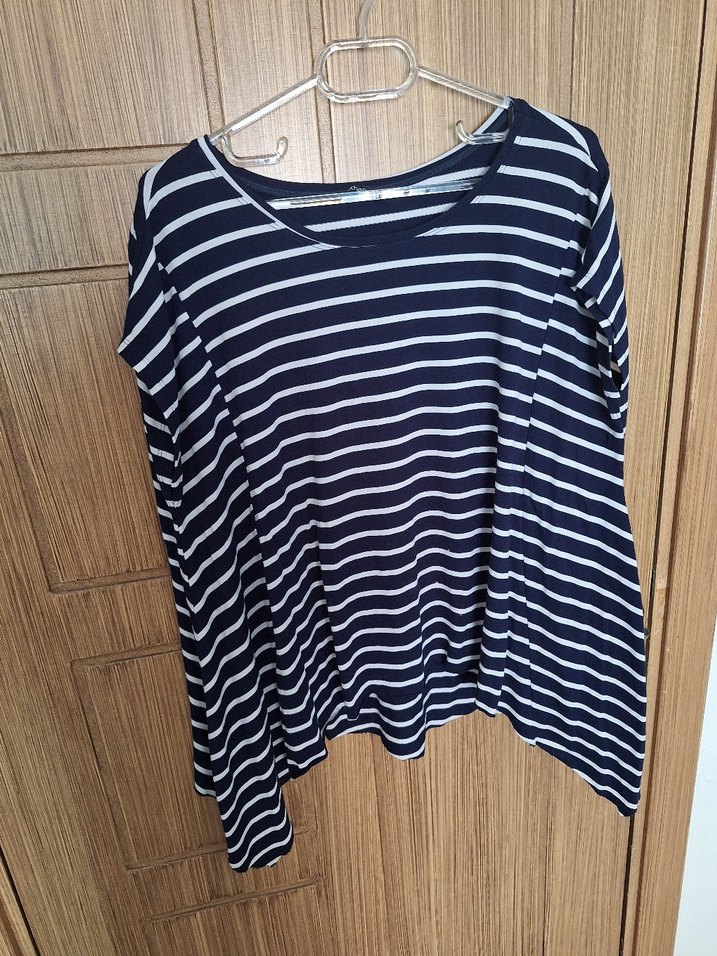 Lacivert çizgili hamile bluzu, kısa kollu ve tekne yaka. Pamuklu kumaştan, bol kesim ve pile detaylıdır. Günlük rahat sokak stili için uygundur. marka temsilidir asimetrik kesim