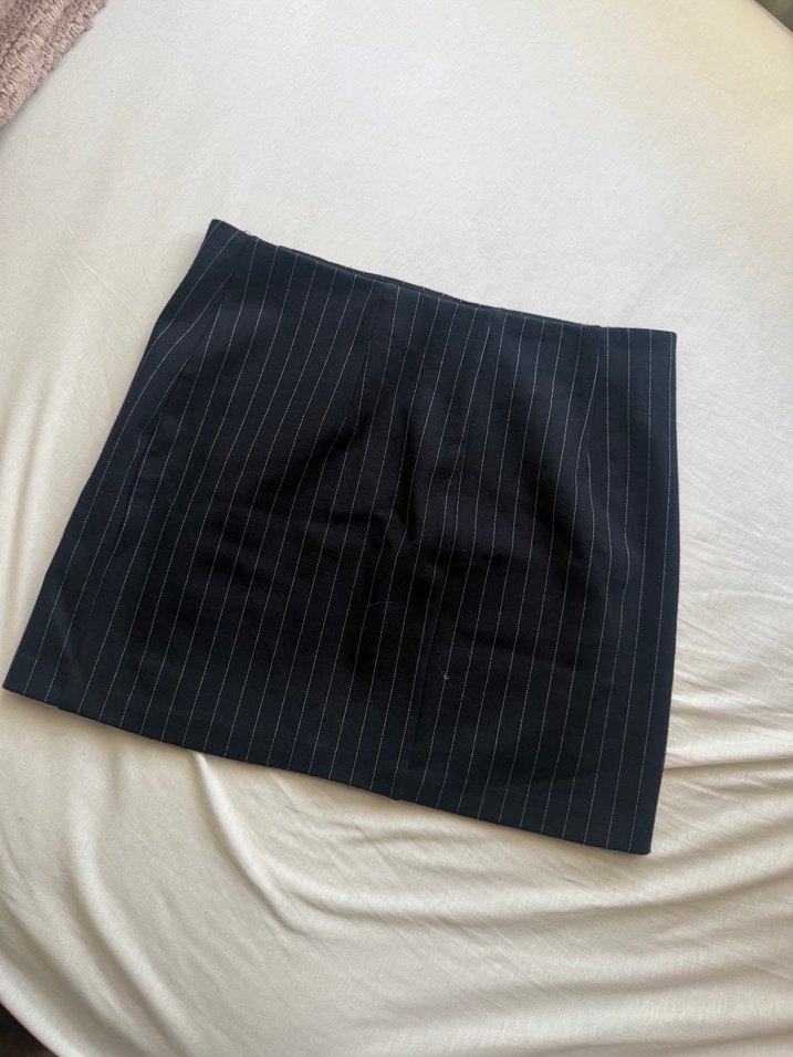 Sentetik kumaştan yapılmış, çizgili siyah midi etek. Ofis kullanımı için uygun, pileli ve normal kesim.