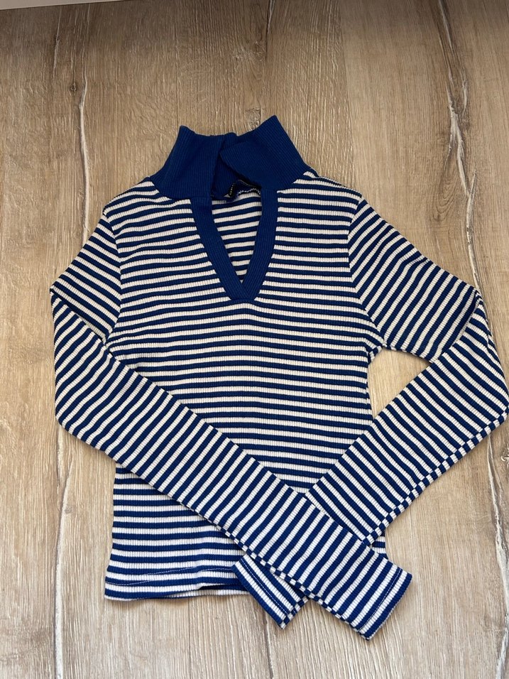 Uzun kollu, yakalı ve fit kesim kadın kazak. Pamuklu, lacivert çizgili ve günlük kullanıma uygun rahat bir sokak stili sunar.