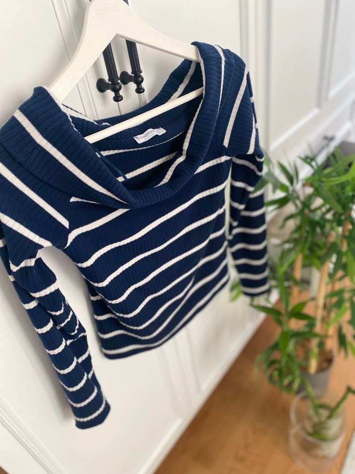 Triko, çizgili, lacivert ve gri renklerde, tekne yaka ve uzun kollu, vücuda oturan kadın sweatshirtü. Günlük kullanıma uygun, Paris sokak modası tarzında, normal boyda.