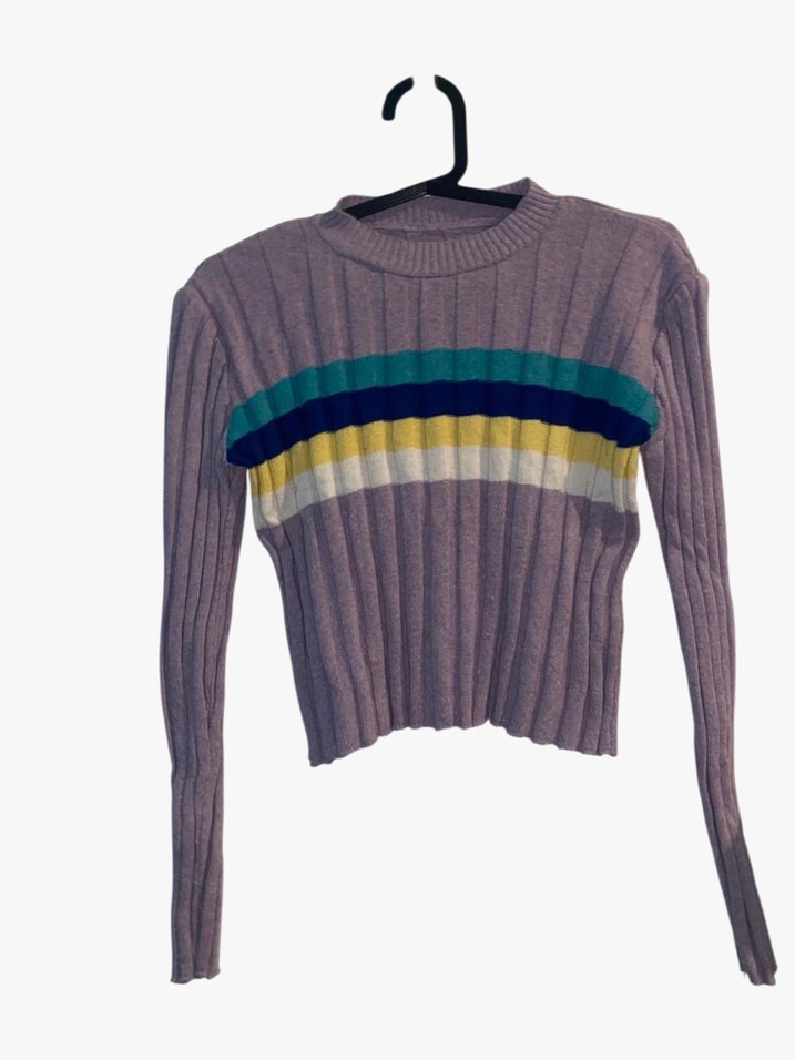 Fitted kesim, uzun kollu, yuvarlak yaka kadın triko crop kazak. Çok renkli yatay çizgilerle rahat ve trend bir görünüm sunar. S-m uygun