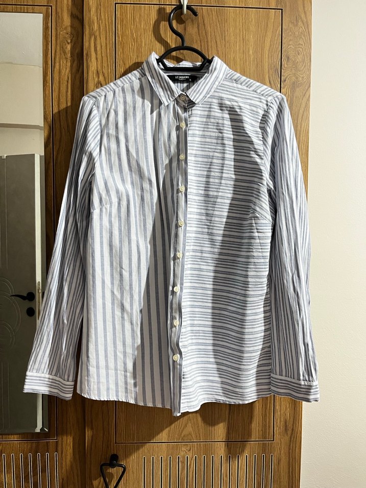 Çizgili Mavi Beyaz Kadın Uzun Kollu Gömlek
