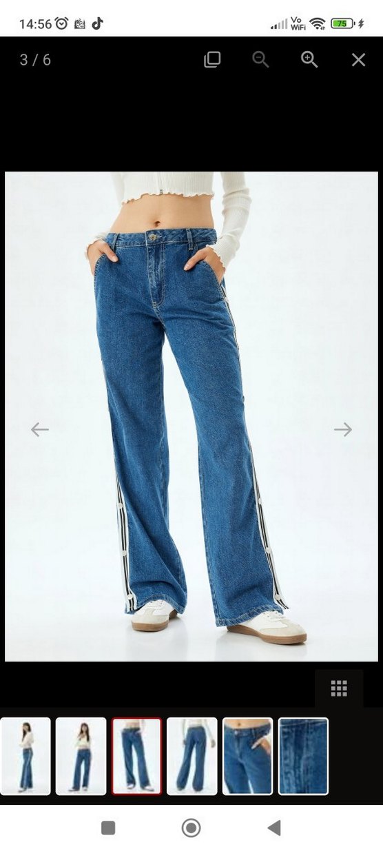 Çizgili yan detaylı, kemerli, bol kesim mavi kot pantolon. Günlük kullanıma uygun rahat ve şık bir modeldir.