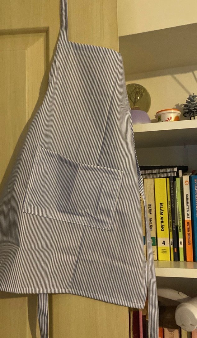 Çizgili desene sahip mavi mutfak önlüğü, ön cep ile kullanışlıdır. Dayanıklı ve temizlemesi kolay kumaştan üretilmiştir.