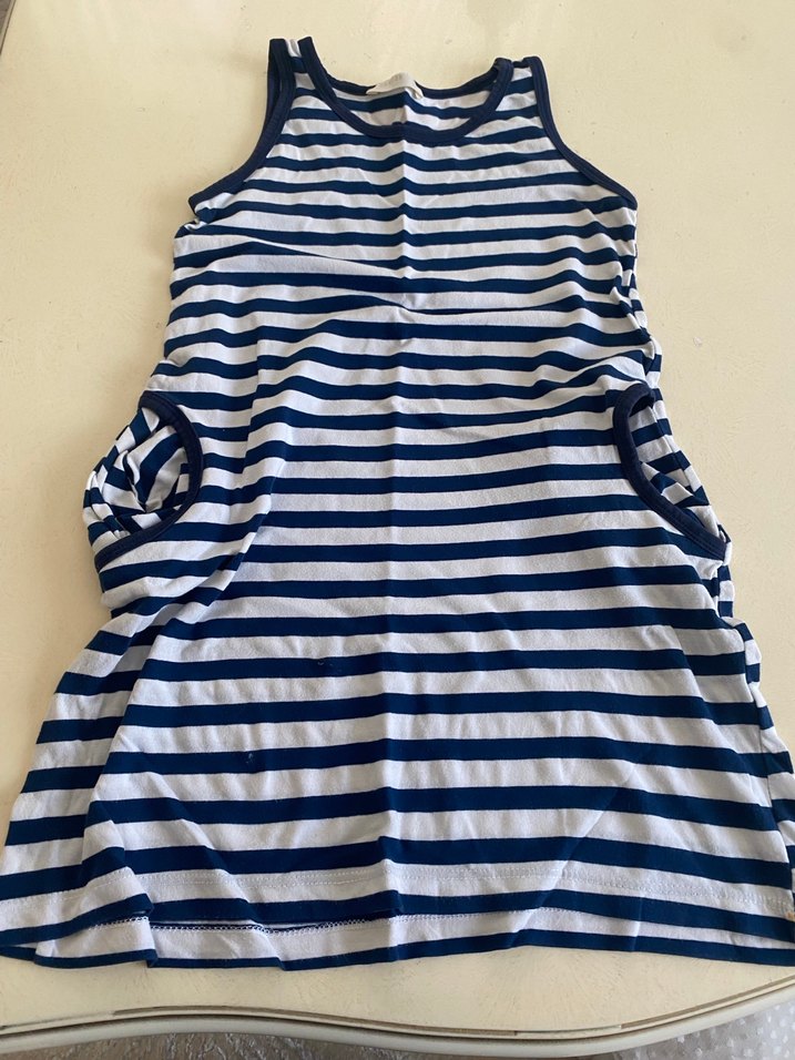 Çizgili, mavi ve gri renklerde, kolsuz çocuk elbise, rahat kullanım sağlar. 8 yaş