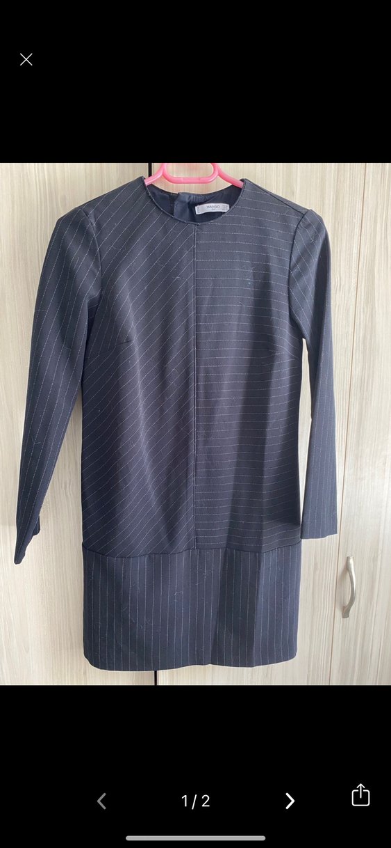 Uzun kollu, regular fit, gri çizgili mavi kadın ofis elbisesi. keskin yakalıdır. İş ortamına uygundur. Mango hiç kullanılmadı.xs ama s bedene de rahatlıkla olur