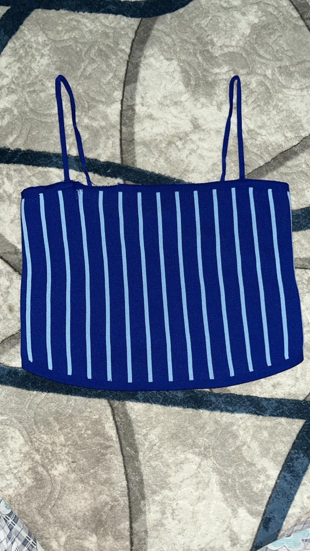 İnce askılı, tekne yaka ve çizgili desenli koyu mavi triko crop top. Günlük sokak tarzı için uygun.