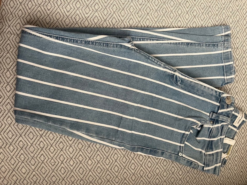 Mavi kot kumaştan, beyaz çizgili, pilili ve normal kesim midi etek. Günlük sokak tarzına uygun rahat bir model.