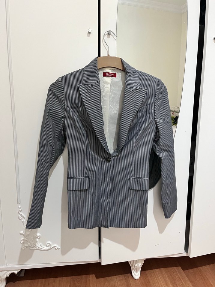 Mavi çizgili blazer, kesik yaka, düğmeli ve uzun kolludur. Normal kesim ve midi boyda, ofis ve günlük kullanıma uygundur. Az kullanılmıştır