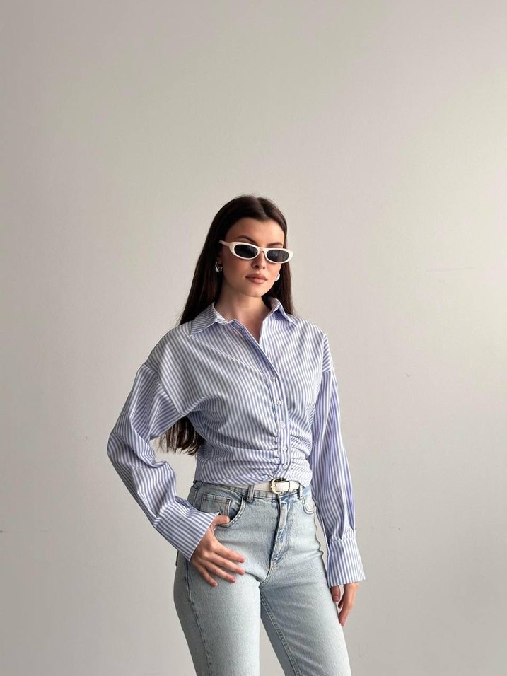 Çizgili mavi kadın gömleği, yakalı ve uzun kollu, regular fit ve midi boyda olup günlük kullanıma uygun rahat şıklık sunar.