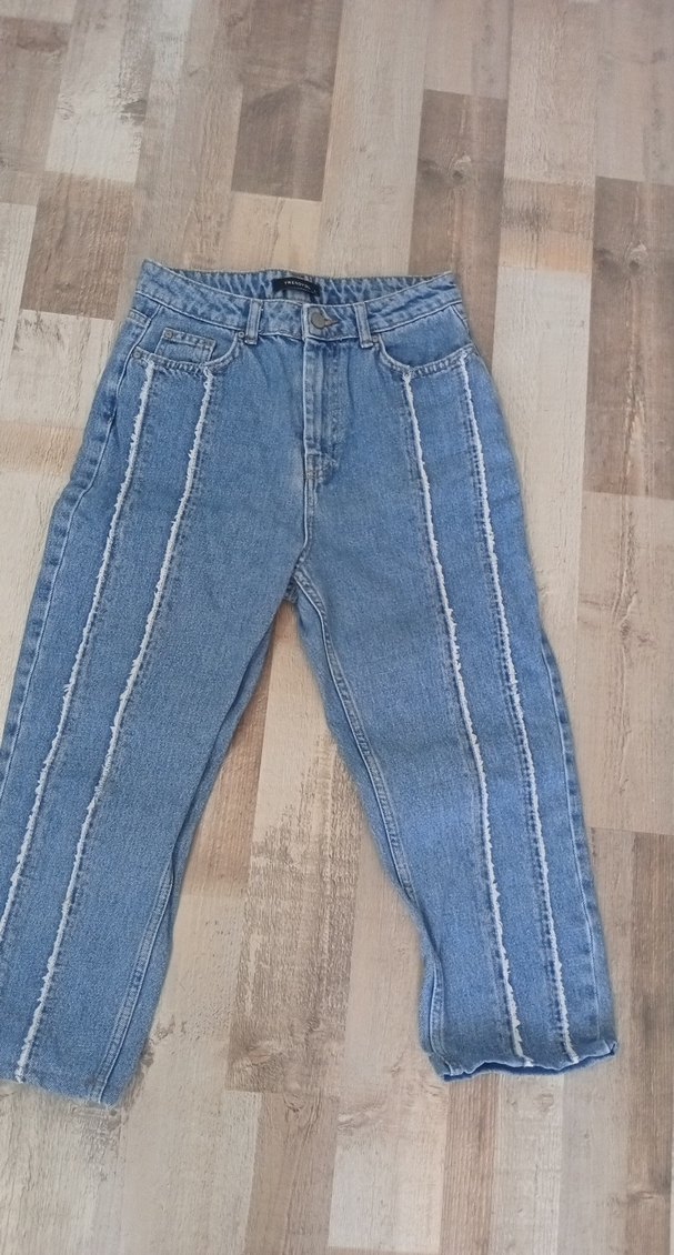 Mavi denim kadın jean, çizgili desene detayına sahiptir. Midi boyda, rahat kesim ve günlük sokak stiline uygundur.
