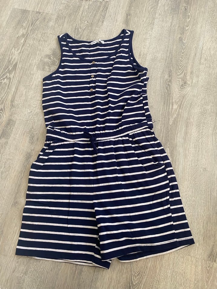 Pamuklu, kolsuz, çizgili ve düğmeli bu koyu mavi tulum, günlük sokak stiline uygun, vücuda oturan bir kesime sahiptir.