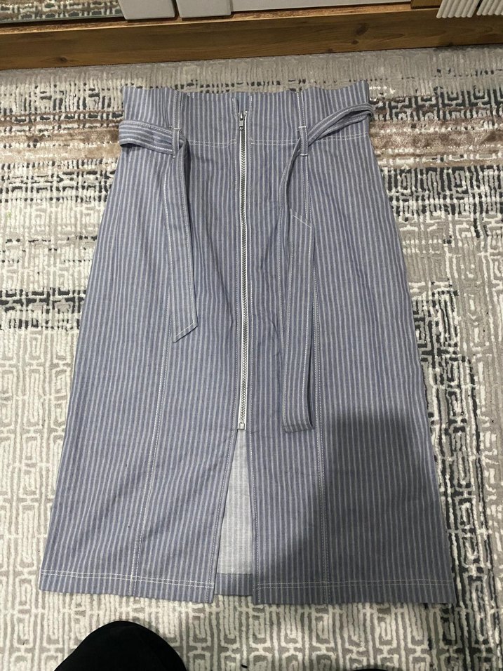 Mavi ve gri çizgili, kemerli ve ön fermuarlı uzun etek. Sentetik kumaştan, bohem tarzda, rahat kesim, günlük kullanım için uygundur.