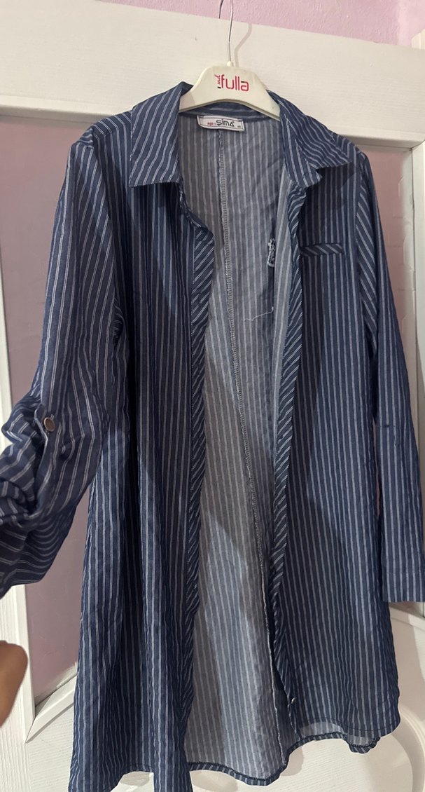 Mavi denim kumaştan yapılmış, düğmeli, uzun kollu ve kesik yaka özelliklerine sahip çizgili gömlek. Rahat kesimi ve günlük kullanıma uygun tarzıyla dikkat çeker.