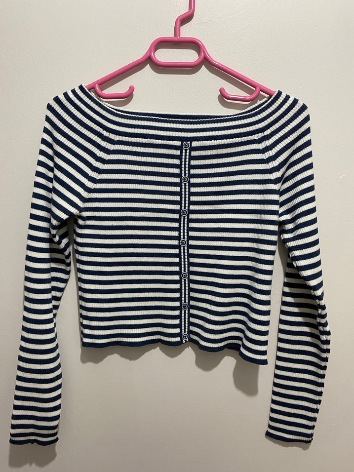Mavi beyaz çizgili, uzun kollu, tekne yaka, normal boyda, Paris tarzı günlük kullanıma uygun kadın triko. 1 defa giyildi sadece. Hiç bir kusuru yok. Bedeni xl ama S-M-L bedene uyumlu olur.