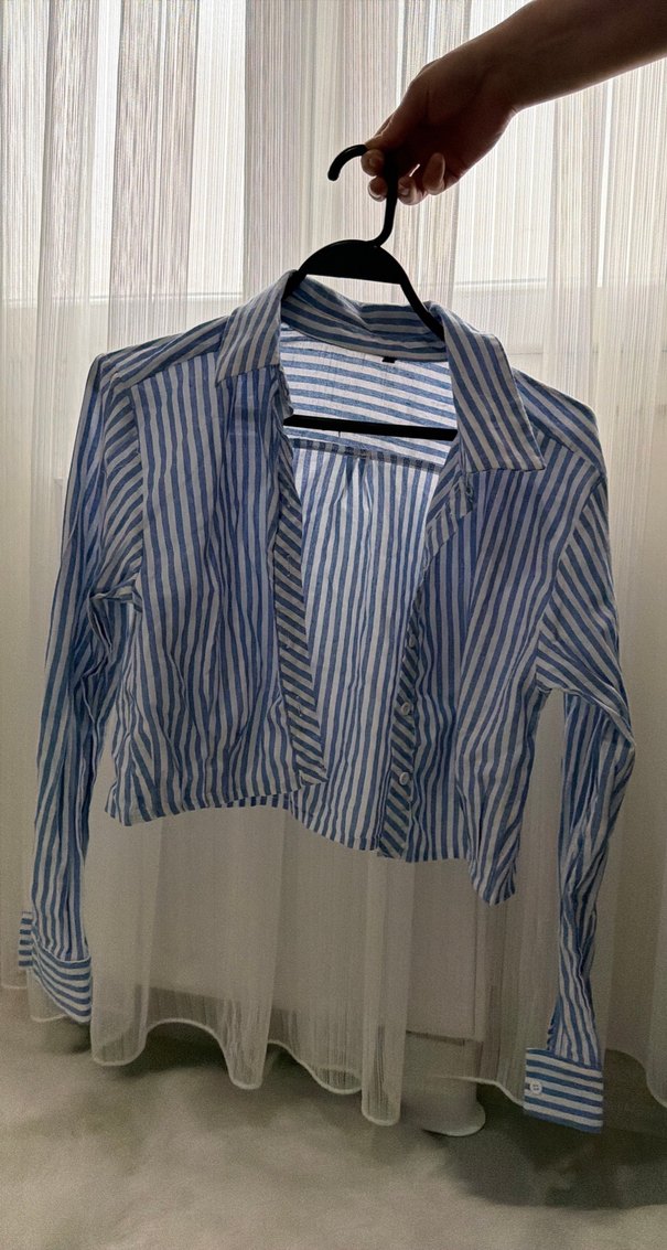 Çizgili Mavi Keten Kadın Gömlek