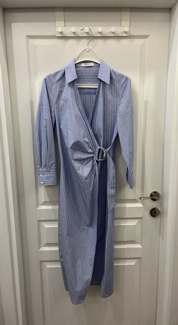 Midi boy mavi çizgili ince kumaşlı gömlek elbise. Çok beğenerek satın almış olmama rağmen önü açıldığı için pek rahat kullanamadım. Fotoğrafta çekmiş olduğum gibi etek kısmına bir lastik parça dikerek açılmasını engellemeye çalıştık. (Sökülüp çıkartılabilir.) Fakat pek etkili olmadı rahat kullanamadığım için satmak durumunda kalıyorum herhangi bir sorunu yok çok az kullanıldı ve yeni aldı. S beden için uygundur.