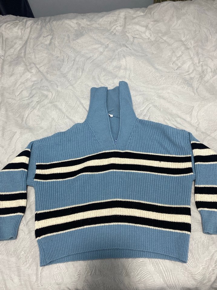 Fitted kesim, mavi örgü kazak, yakalı ve uzun kollu. Gri ve siyah çizgilerle süslenmiş, günlük kullanıma uygun rahat bir model.