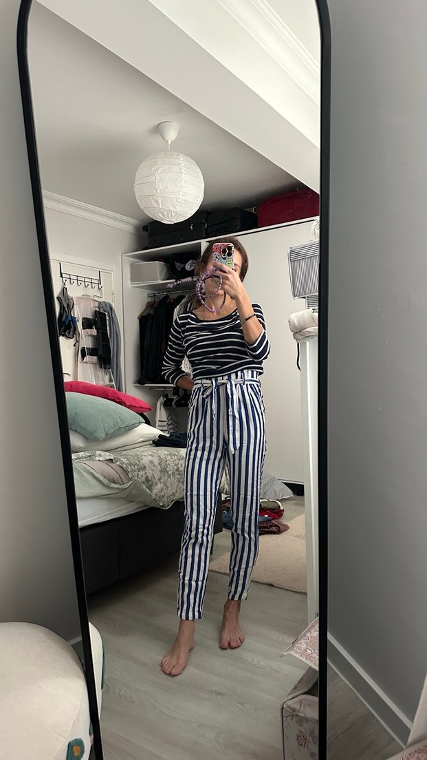 Mavi çizgili pantalon. kemerli, günlük rahat stil. Çok az kullandım, doğum sonrası dolabımı yenilediğim için satıyorum