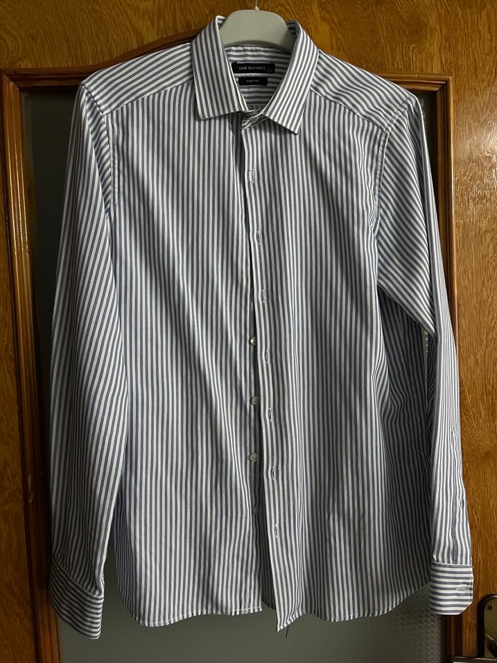 Notch yakalı, düğmeli ve uzun kollu erkek gömleği. Çizgili deseni ve regular fit kesimiyle, ofis ve günlük iş tarzına uygundur. Mavi renk, sentetik kumaş.