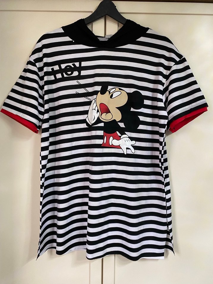 Siyah beyaz çizgili, Mickey Mouse baskılı, düğmeli kısa kollu, normal boy hamile tişörtü. Kırmızı kol detayları ve rahat kesimiyle günlük kullanıma uygun.