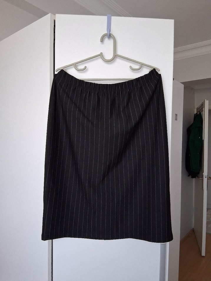 Siyah ve gri çizgili, bol kesim midi etek. Sentetik kumaştan, ofis kullanımı için uygun. hiç giymedim