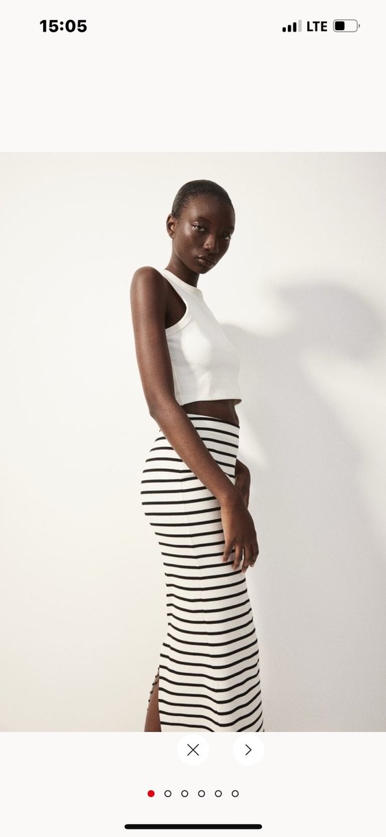 Siyah beyaz çizgili, yan yırtmaçlı, yumuşak sentetik kumaştan yapılmış, günlük sokak stiline uygun oturan midi hamile eteği. boyu 92cm beli 40 cm vücuda göre esner