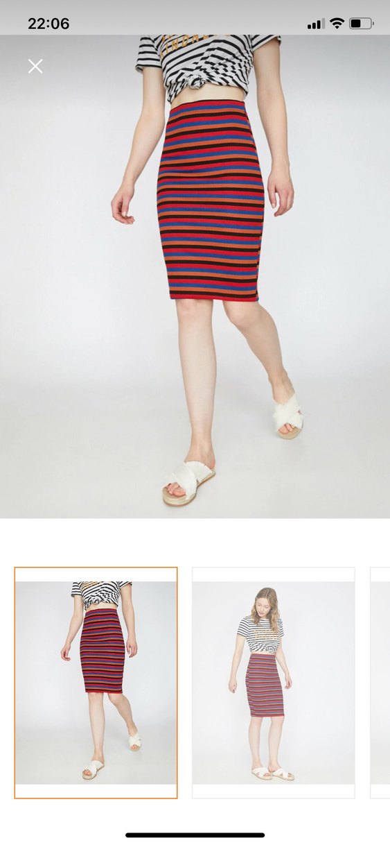 Çok renkli çizgili, vücuda oturan midi hamile eteği. Yumuşak sentetik kumaştan üretilmiş, günlük kullanıma uygun rahat ve şık bir parça.