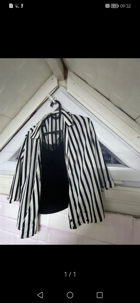 Gri beyaz çizgili blazer, kesikli yaka, askılı kol ve pile detaylarına sahiptir. Normal kesim ve sentetik kumaştan üretilmiştir, günlük kullanıma uygundur. Trendy rahat stil için ideal.