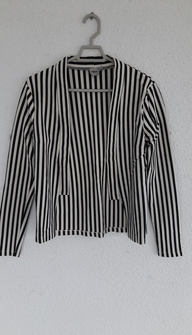 Uzun kollu, kesik yaka ve pilili detaylara sahip çizgili midi kadın blazer ceket. Siyah ve beyaz renklerde, günlük kullanım için uygun, rahat ve trend bir sokak stili ürünü.