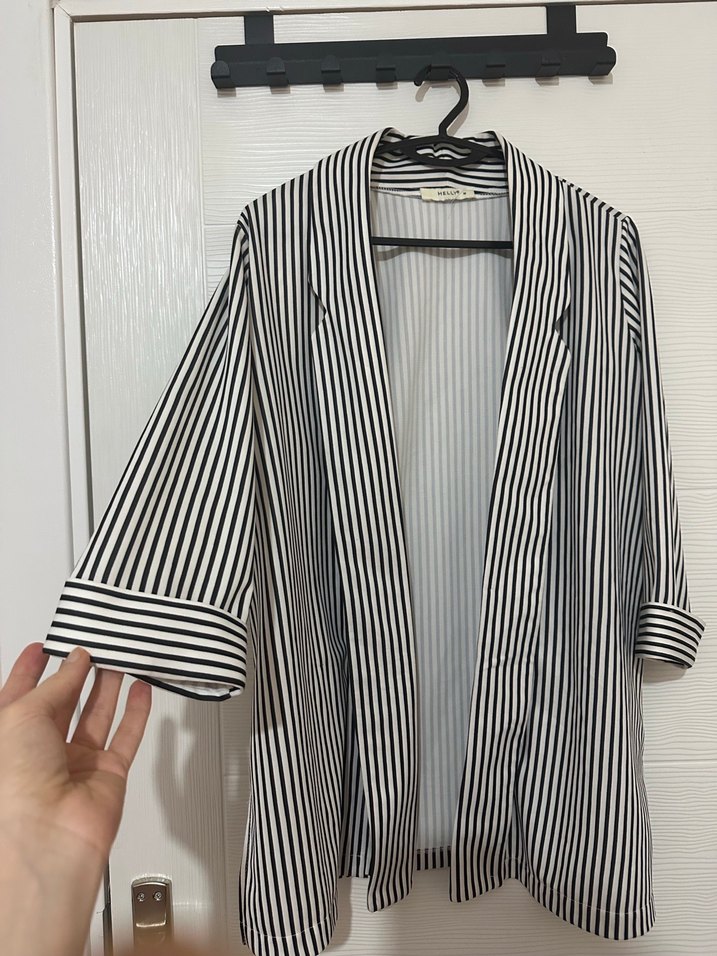 Uzun kollu, pileli ve çizgili midi kadın blazer ceket, regular fit ve kesikli yaka ile ofis kullanımı için uygundur. Siyah-beyaz renklerde, sentetik kumaştan üretilmiştir. Yanlarında yırtmaç mevcuttur. Kemeri vardı fakat kemersiz kullandığım için kaybettim kemeri fakat isteyen güzel bir kemerle kombin edebilir .