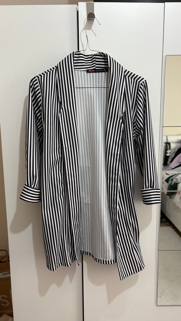 Çizgili desenli, normal boy midi kadın blazer. Uzun kollu, pileli detaylı ve regular fit. Lacivert ve beyaz renklerde, sentetik kumaştan üretilmiştir.