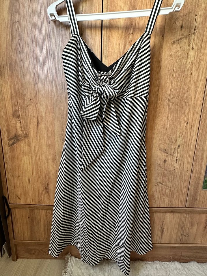 Siyah beyaz çizgili, ince askılı midi elbise. Önde fiyonk detayı Midi elbise Ayarlanabilir askılı Bel: 70 cm Göğüs: 90-95 cm Elbise uzunluk: 100 cm