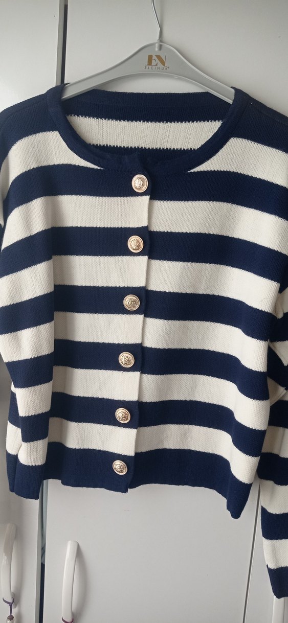 Düğmeli, uzun kollu, beyaz ve lacivert çizgili pamuklu kadın hırka. Salaş kesimi ve tekne yaka detayıyla günlük sokak stiline uygundur.