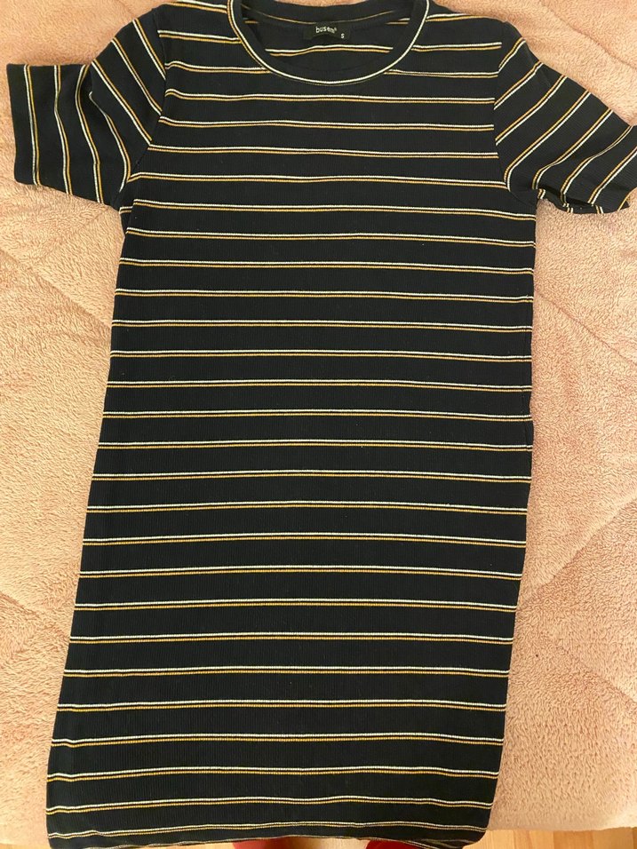 Kısa kollu, beyaz sarı çizgili,dar kesim midi elbise. Günlük kullanıma uygun.