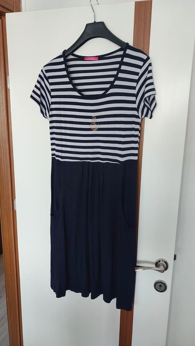 Pamuklu, çizgili midi elbise, bol kesim ve kısa kollu. Yuvarlak yakalı, pileli etekli, rahat ve günlük kullanıma uygun.