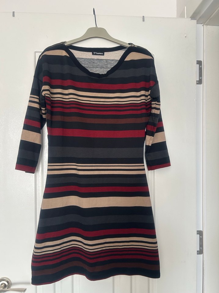 Uzun kollu, kayık yaka ve çizgili midi boy triko elbise. Sentetik kumaştan örülmüş, koyu renkli çoklu çizgilerle bohem tarzda, günlük kullanıma uygun. Kemeri de vardı bulamadım,bu şekilde de gayet rahat kullanılabilir veya başka bir kemer ile kombinlenebilir