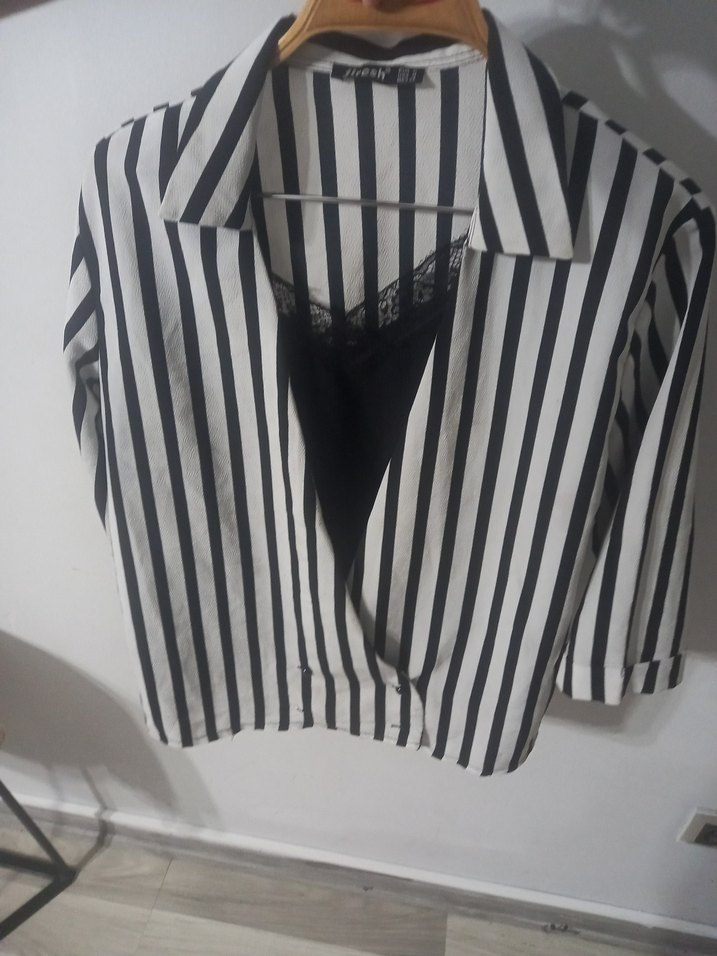 Düğmeli ve yakalı, kısa uzunlukta çizgili gömlek. Sentetik kumaştan, salaş kesim ve Paris tarzı sokak modasına uygun. Gri ve beyaz çizgilerle şık görünüyor.