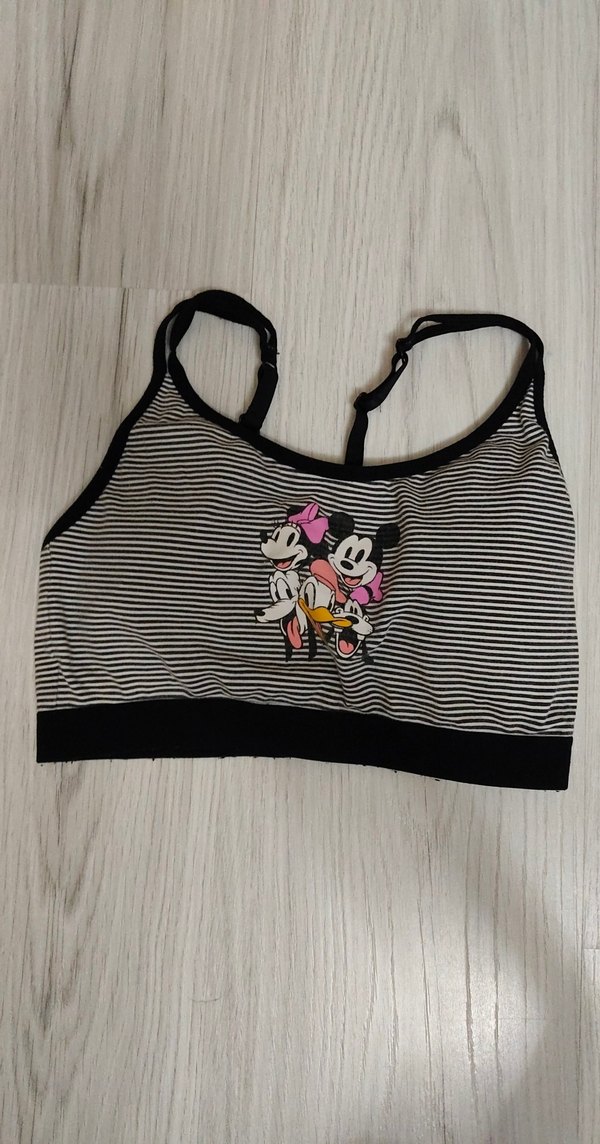 Ayarlanabilir askılı, çizgili kısa spor sütyeni. Önünde Mickey ve arkadaşlarının baskısı var. Siyah tabanlı, sokak stili için uygun.