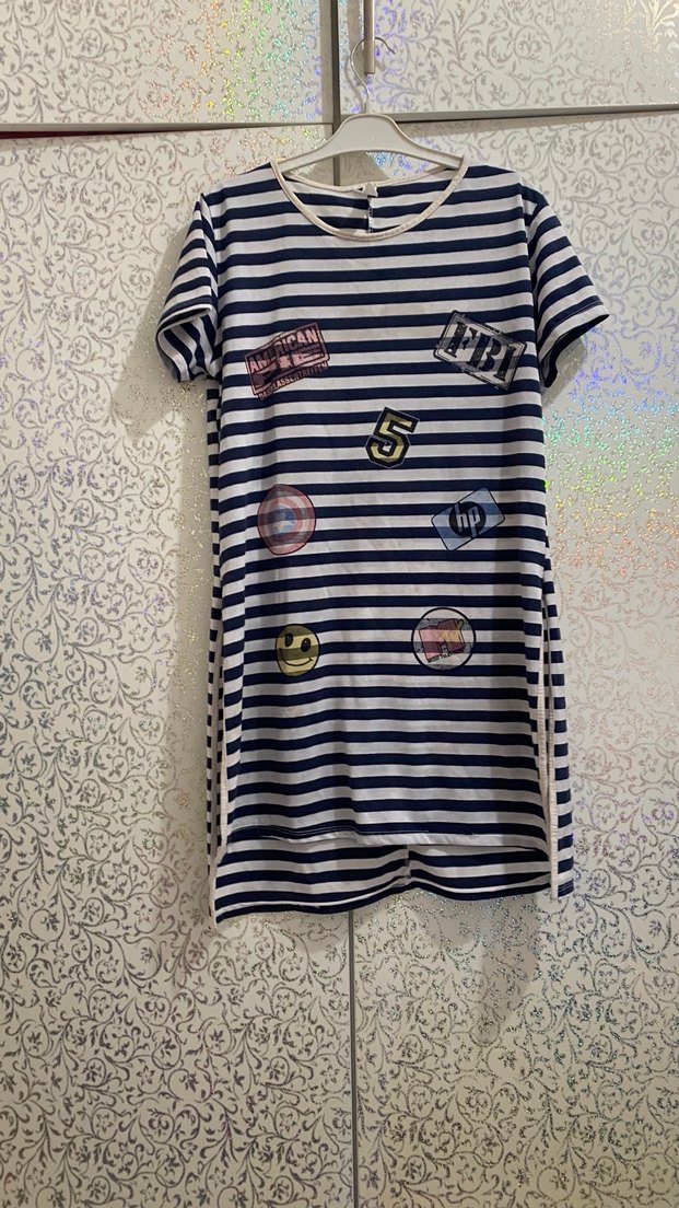 Yatay çizgili, nakışlı ve düğmeli detaylara sahip, bol kesim kısa kollu kız tişörtü. Yumuşak tekstil kumaştan, çok renkli açık tonlarda.